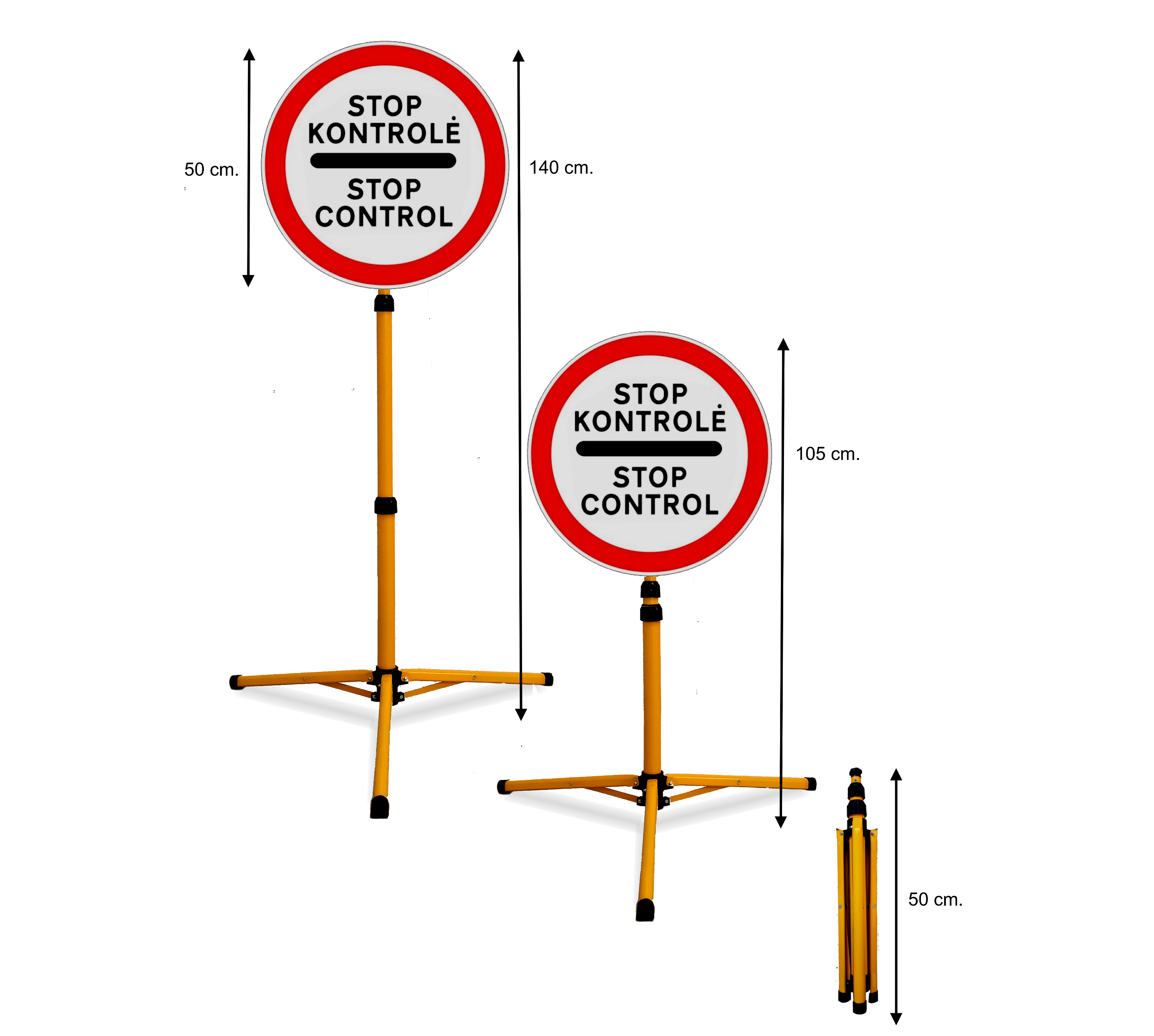Pastatomas Teleskopinis Ženklas “STOP kontrolė”. Šviesą atspindintis, todėl ryškiai matomas tamsiu paros metu priartėjus automobiliui su šviesomis ar prožektoriumi. Tvirtas, lengvas, atsparus įvairioms oro sąlygoms, tinkamas naudoti lauke ir viduje. Greitai ir paprastai išskleidžiamas 140cm. aukščio ženklas. Tvirtas, lengvas, 3mm. storio, 50cm. pločio ženklas.